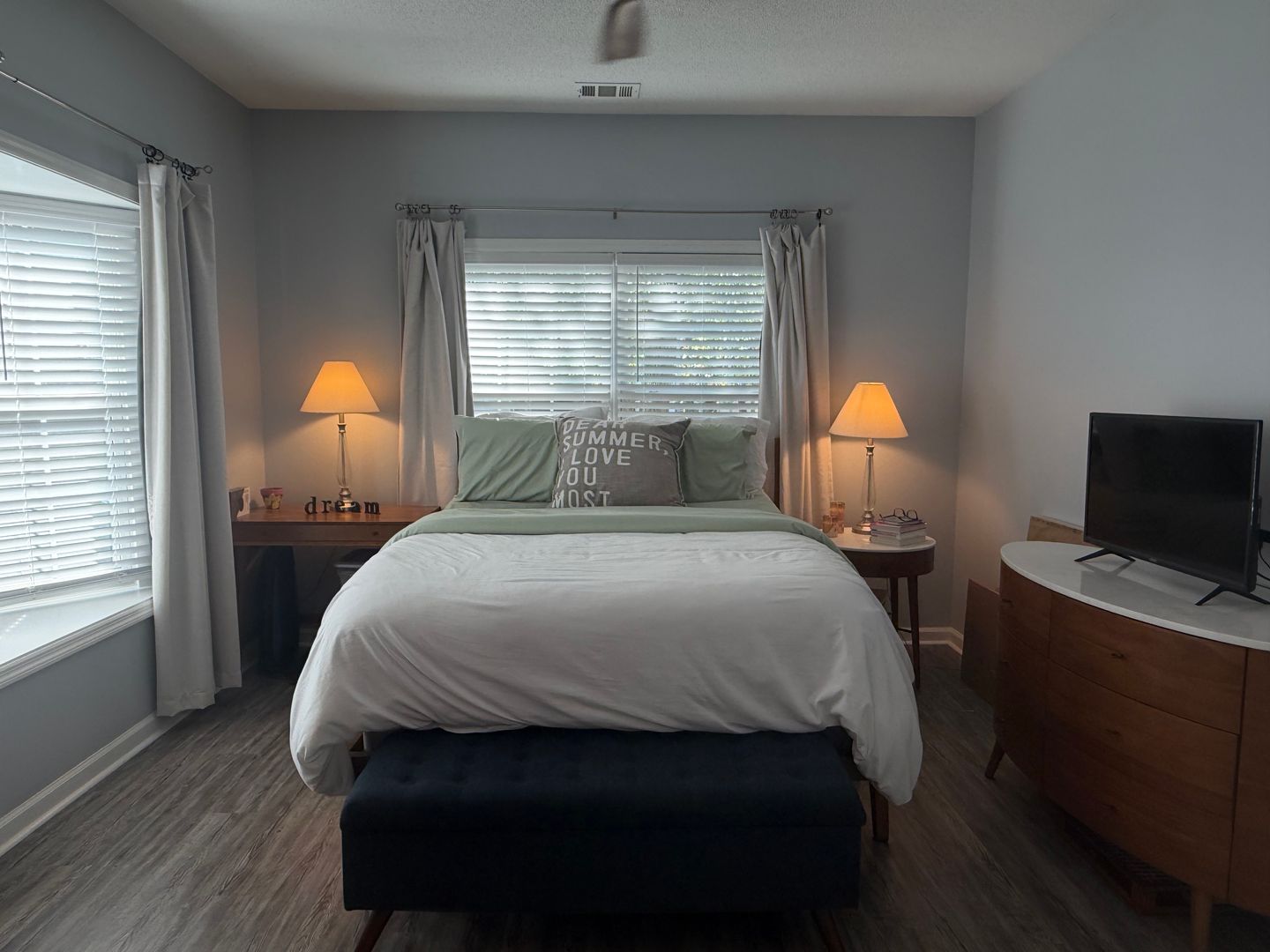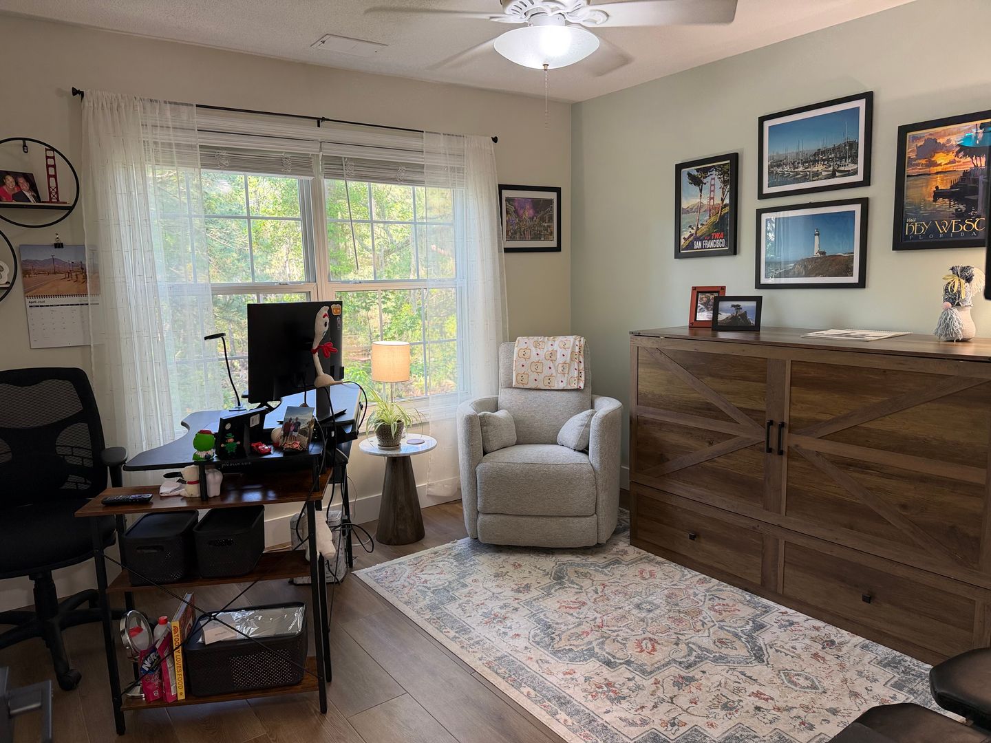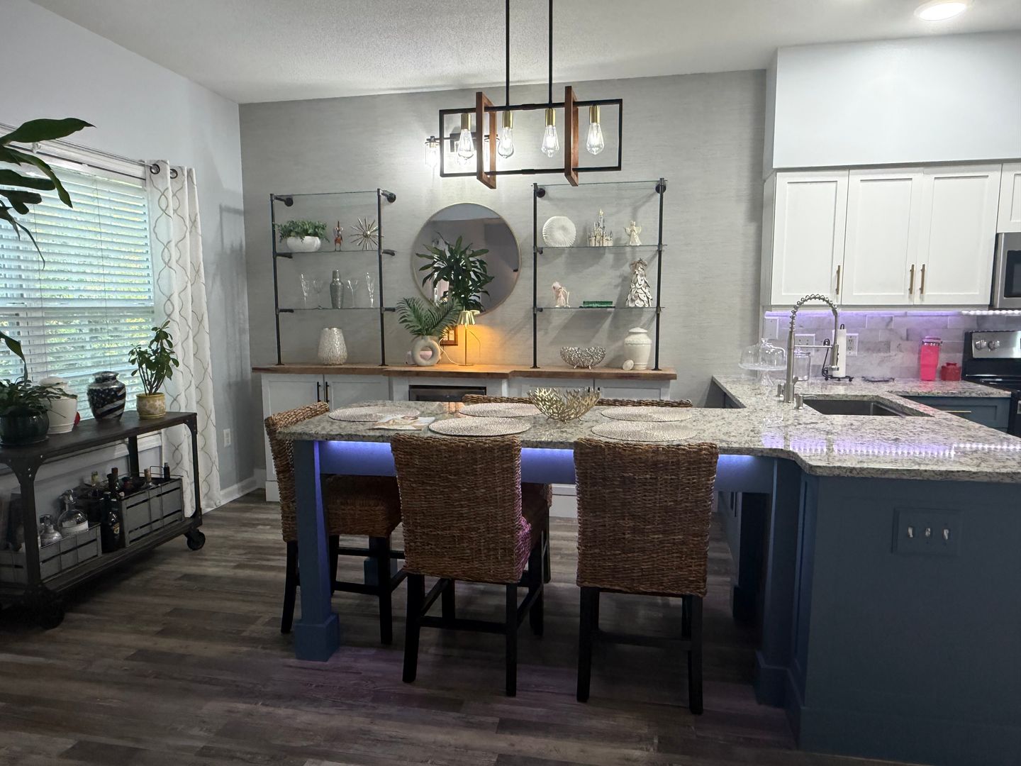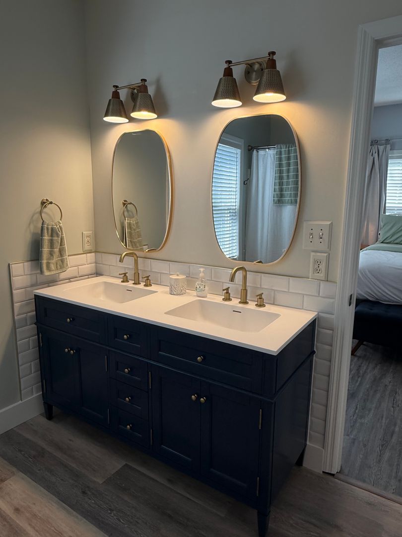 Upon entering the home, you will see how well maintained it is. Freshly painted, new flooring, a custom kitchen countertop extension which serves as a dining room table, custom built-ins with open shelving and storage, updated appliances, and coastal chic light fixtures. The primary bedroom is on the first floor and includes a newly updated primary bathroom and walk-in closet. Upstairs you will find two guest bedrooms and a remodeled guest bathroom with a tub/shower. A laundry closet with a full size washer and dryer is upstairs as well. The guest bedroom being used as an office has a custom furniture piece which is a pull-out bed (photo coming). This piece of furniture will remain.